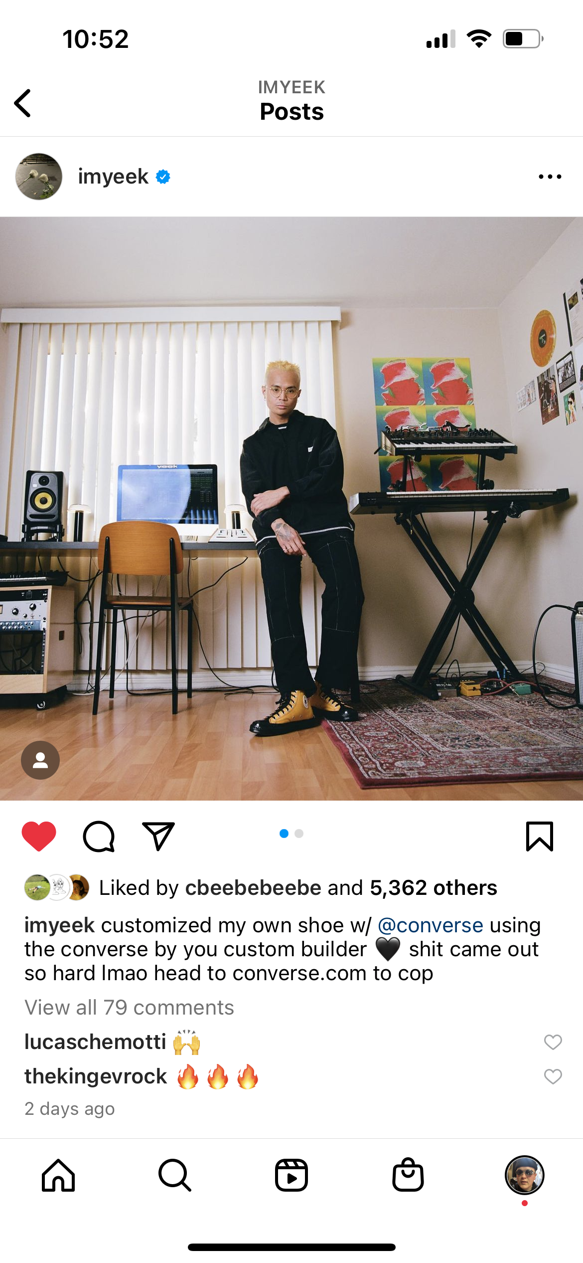 Yeek is a Musician and DJ from LA who marked his Chucks with a familal Valenica Orange that points back to his Floridian roots and is a signature color scene and felt across is albums and art.